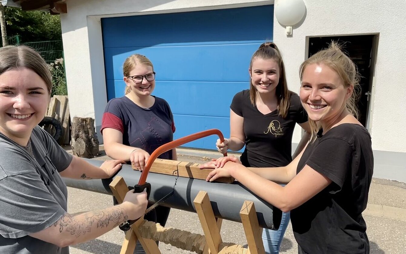 Am Dienstag, dem 18. Juli um 8:00 Uhr begannen die Azubis ihre gemeinsame Fahrt zum Bruckwald. Vor Ort teilten sie sich in festgelegte Arbeitsgruppen auf. Eine Gruppe hatte bereits das gemeinsame Frühstück mit Brezeln, Melone und Getränken organisiert. Eine andere Gruppe baute das Brennholzlager am alten Standort ab und eine weitere grub insgesamt 14 Löcher am neuen Standort. Zusätzlich wurden Rohre für die Verschalung eines stabilen Betonfundaments in 14 gleich große Stücke gesägt. Christian Gerlach und Thomas Bührer, die Verantwortlichen für die Forstgruppe der Einrichtung Am Bruckwald, unterstützten die Azubis dabei.