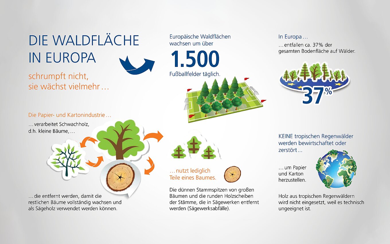 Die gesamte europäische Papierindustrie verwendet 87 % nachwachsende Rohstoffe, davon 46 % recycelte Papierfasern und 40 % frischen Holzschliff. 90 % des Holzes stammt aus der Europäischen Union, 60 % aus Wäldern, die von unabhängigen Dritten als nachhaltig zertifiziert wurden. (Quelle: Pro Carton)