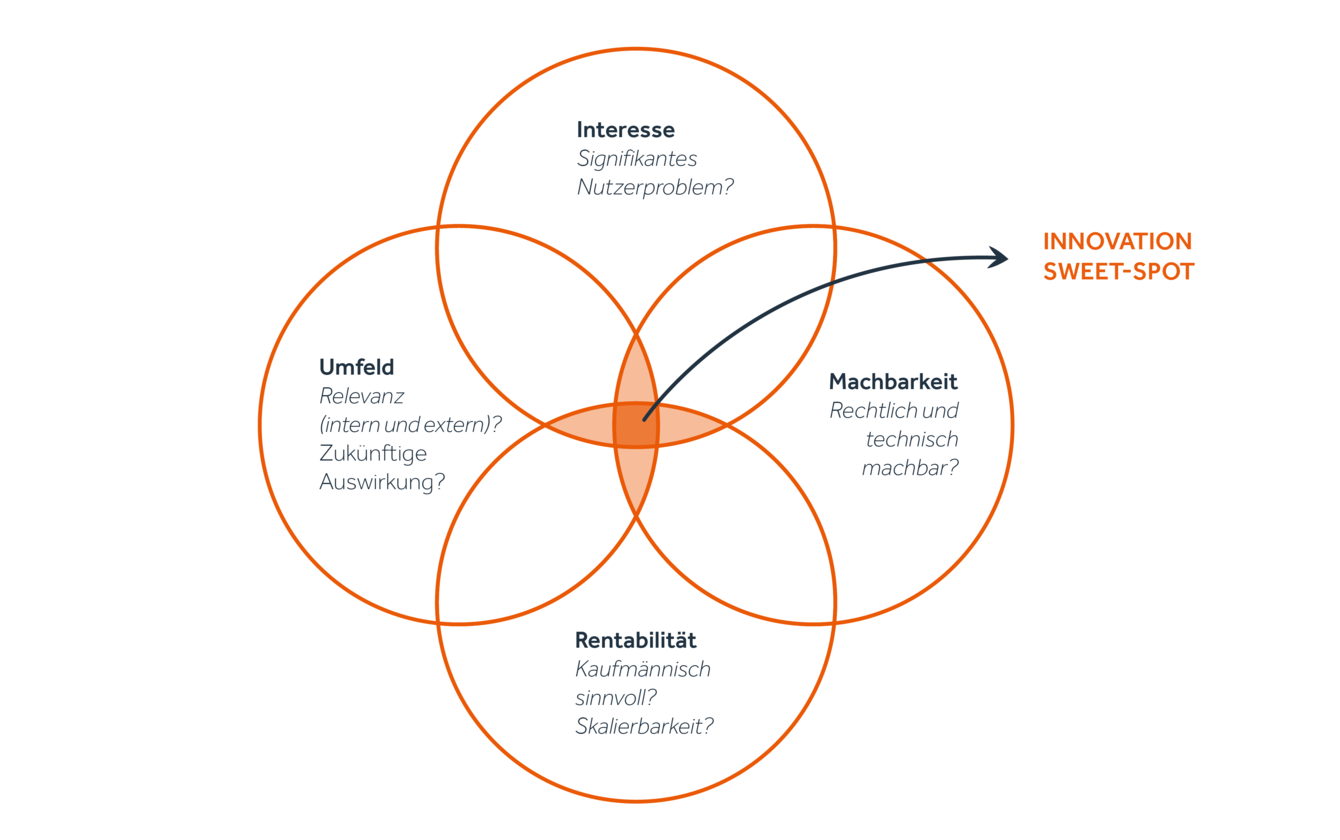 Im PIP kommen Methoden aus den Bereichen Design Thinking, Lean Management, Scrum und Business Model Innovation zum Einsatz. Diese unterstützen die Teams bei der Entwicklung neuer Produktideen und helfen dabei, die richtigen Fragen zu stellen. Denn es gilt, die vier Kriterien des Modells – Umfeld, Interesse, Machbarkeit, Rentabilität – zu prüfen. Umfeld bedeutet: die Idee wird intern sowie extern auf Relevanz kontrolliert. Durch genaue Überprüfung des Interesses wird festgestellt, ob die Idee gebraucht wird. Machbarkeit stellt sicher, dass diese rechtlich und technisch umsetzbar ist, die Rentabilität beschreibt die wirtschaftliche Profitabilität der Innovation. „Für eine erfolgreiche Entwicklung müssen wir alle vier Kriterien betrachten und in eine Balance bringen. Wo sich dieses Quartett überschneidet, liegt der sogenannte Innovation Sweet Spot“, erklärt Löffler. „Diesen gilt es zu treffen, um sicherstellen zu können, dass wir die Produkte und Services nicht an den Bedürfnissen unserer Kunden vorbei entwickeln.“