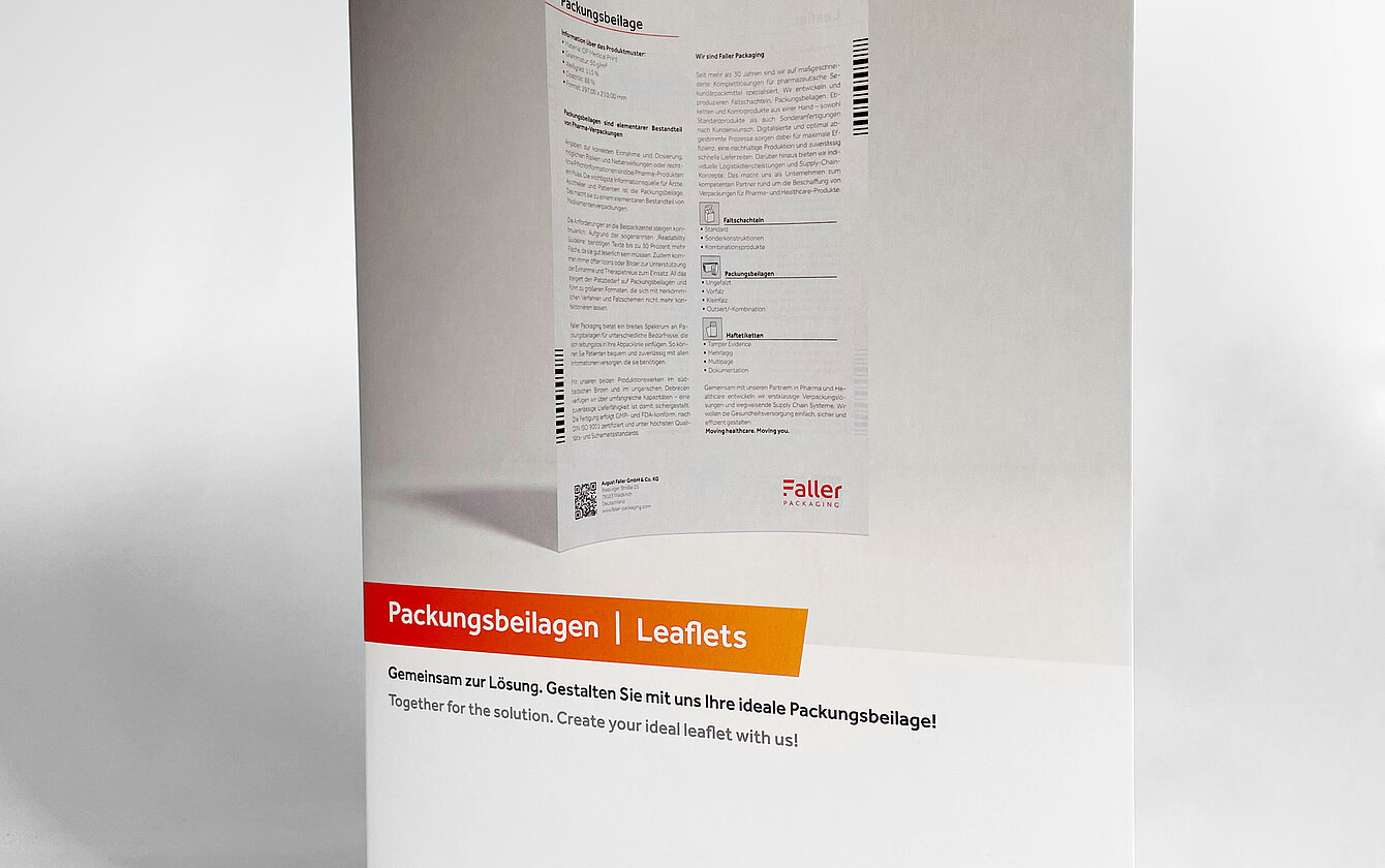 Faller Packaging has been supplying its customers for many years with package leaflets in individual sizes, formats and materials, all customised for the product in question and the processes and conditions involved in its production. This ensures that patients can access all the information they need reliably and quickly. All the leaflets are produced in GMP- and FDA-compliant manufacturing processes, which adhere to the strictest quality and safety standards.